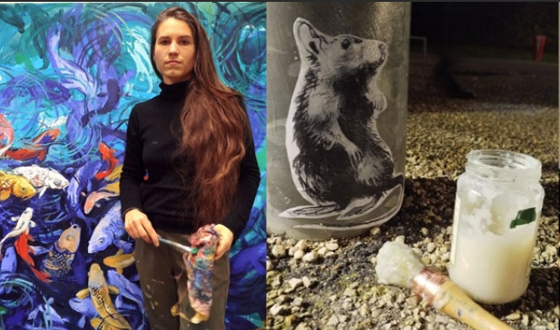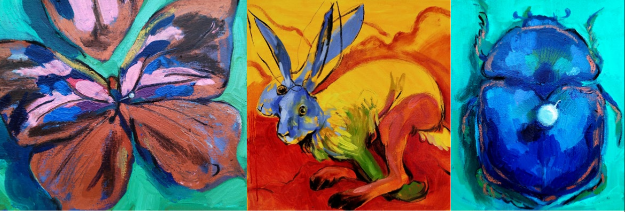 La peinture La Louve (huile sur toile, 150 × 200 cm) incarne pleinement cette recherche : figure ambivalente, nourricière et politique, sauvage et fondatrice, elle interroge nos récits collectifs et les formes de pouvoir que nous projetons sur le vivant. Papillon, Lièvre, Coléoptère bleu complètent cet bestiaire peint à l’huile, auquel s’ajoutent des œuvres issues des ateliers partagés avec les élèves : dessins, performances, collages temporaires investissant les murs de l’établissement.