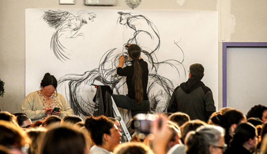 La résidence ne s’est pas construite à huis clos. L’atelier est devenu un lieu de passage : les élèves y venaient librement, pour échanger, confronter leurs points de vue, parfois se disputer. Paroles et images circulaient ensemble. Les formes — dessin, peinture, performance, collage — ont émergé au fil des rencontres, sans programme fixé à l’avance. Lors du Festival des talents du Campus, une performance dessinée de Sidonie Bilger a prolongé cette dynamique devant un public élargi.
