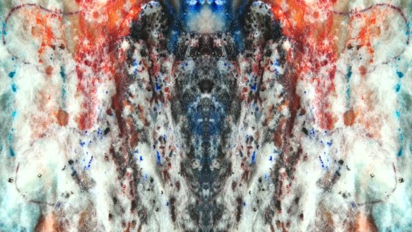 Un grand écran de télévision diffuse en boucle une vidéo dans l’espace d’exposition. Elle est composée des prises de vue d’expérimentations d’écoulements d’encres et d’eau sur la laine lavée.