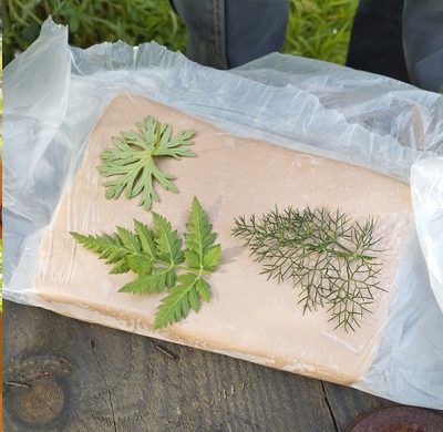– travail de la terre par inclusions de végétaux et prise d’empreintes lors d’une visite du parc,