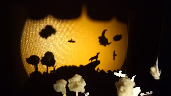 Le théâtre d’ombre représente, dans une immense bouche, une scène de la vie terrestre où espèces (dont l’homme), éléments et milieux cohabitent en harmonie.