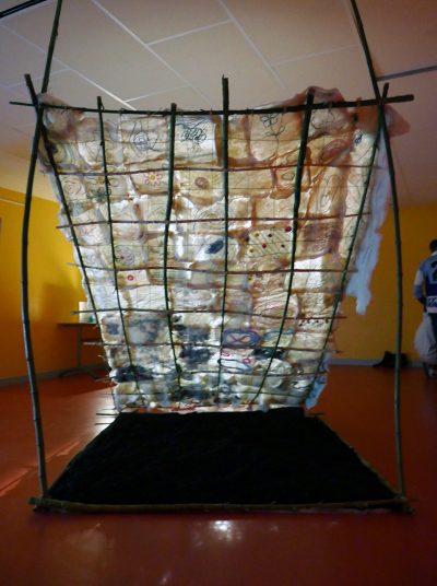 On y retrouve l’abri en bambous recouvert des carrés en laine feutrée assemblés et au sol recouvert de terre. L’ensemble figure comme une trappe donnant accès au sous-sol. Les feutres se lisent aussi bien en recto qu’en verso par effet de transparence du fait des éclairages.