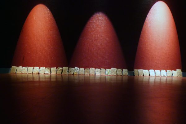Les carreaux de terre avec inclusion et empreintes de végétaux disposés au sol tels des stèles témoignent de la vie éphémère, de l’absorption du sol qui digère et alimente la vie en son sein afin de mieux la restituer aux végétaux et autres vivants dans un cycle perpétuel.