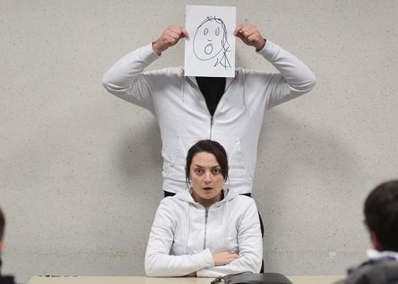 Tantôt narrateurs, tantôt personnages, le duo d’acteurs en tenue de sport, marqueurs noirs et feuilles blanches en main, se partagent tous les rôles au milieu des spectateurs.