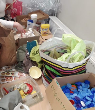 Les élèves avaient apporté un stock important de matériaux divers : bouteilles, bouchons, vieux jouets, tissus, perles, emballages, etc, et puisaient dans ce stock pour confectionner individuellement une marionnette.